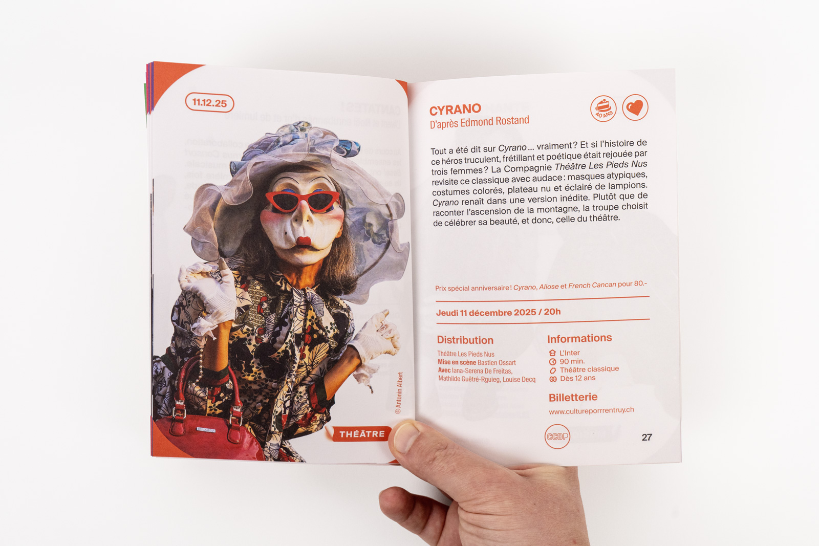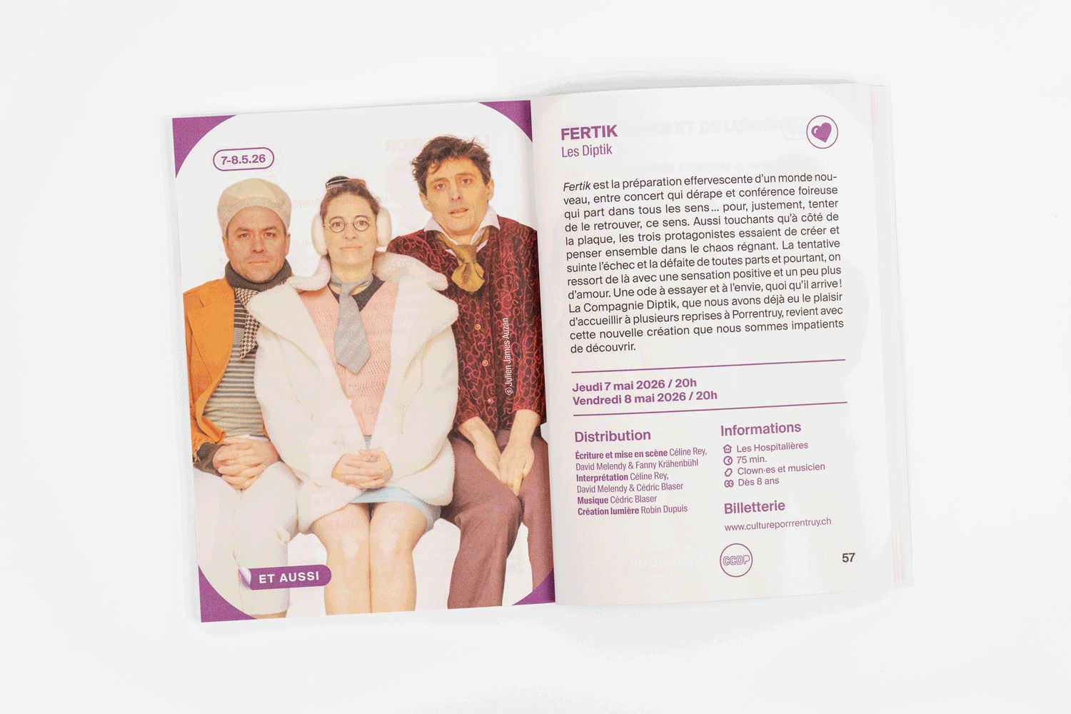 La refonte de l’identité visuelle du CCDP valorise le logo existant en le simplifiant avec des contours superposés et masqués. Cette nouvelle forme, utilisée comme label, dévoile la programmation comme un rideau entrouvert. Une palette de couleurs adaptable à tous les supports de communication met en valeur les différents genres de spectacles. Le label est également décliné en version animée pour refléter les différentes émotions vécues par le public.